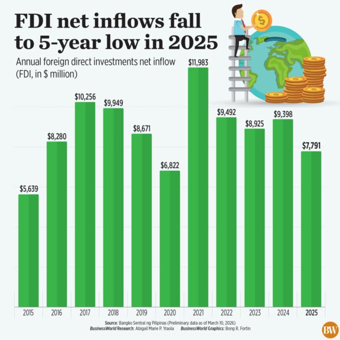 FLUSSI NETTI diretti dall’estero gli investimenti (IDE) nelle Filippine sono crollati a 7,791 miliardi di dollari nel 2025, il livello più basso cinque anni, dati preliminari di Bangko Sentral ng Pilipinas (BSP). ha mostrato.