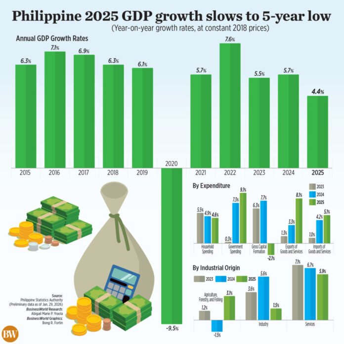L’Autorità statistica filippina (PSA) ha riferito giovedì che il prodotto interno lordo (PIL) del quarto trimestre è aumentato del 3%, dal 5,3% nel quarto trimestre del 2024 e dal dato rivisto del 3,9% nel terzo trimestre del 2025.