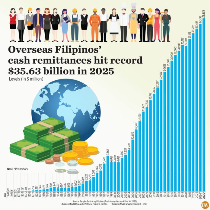 SOLDI INVIATI A CASA di FiliI pino all’estero sono balzati al livello record di 35,634 miliardi di dollari nel 2025, con il peso debole che ha stimolato i guadagni dalla conversione del dollaro, ha riferito lunedì il Bangko Sentral ng Pilipinas (BSP).