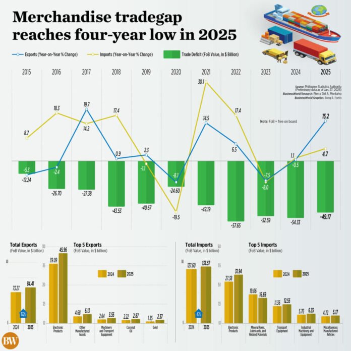 Il commercio di beni nelle Filippine disavanzo si è ridotto al minimo di quattro anni nel 2025, poiché le esportazioni sono aumentate a doppia cifra e la crescita delle importazioni è rimasta contenuta, ha riferito martedì l’Autorità statistica filippina (PSA).