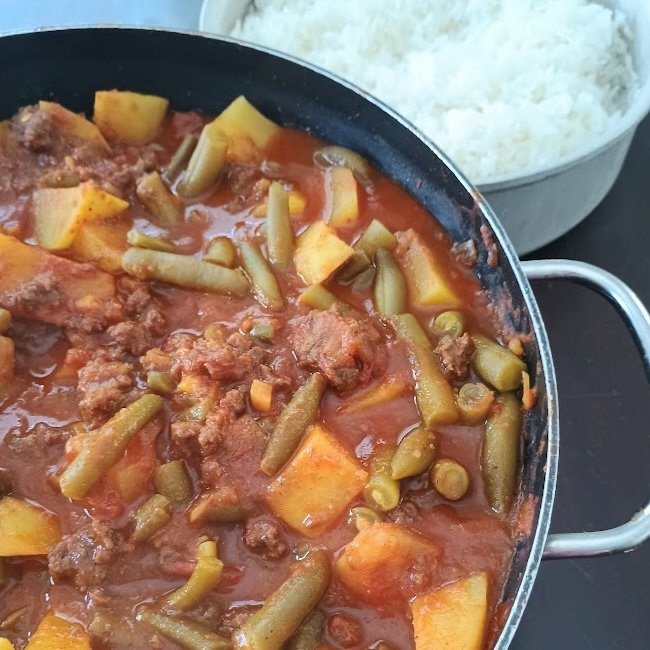 4. Aggiungere i pomodori schiacciati e le patate a dadini e mescolare bene. Mettete il coperchio e lasciate cuocere, mescolando di tanto in tanto, fino a quando le patate saranno tenere. Aggiungete acqua quanto basta durante la cottura in modo che il composto non diventi troppo denso (Io riempio il barattolo di pomodoro con acqua e di solito finisco per usarne circa la metà).